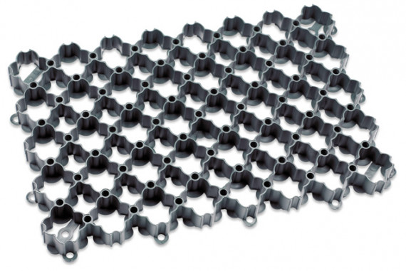 Lightweight permanent ground reinforcement. These are recycled green polyethylene plastic grids, certified to 250 tonnes per square metre. Use seven white parking bay markers per metre of line required.