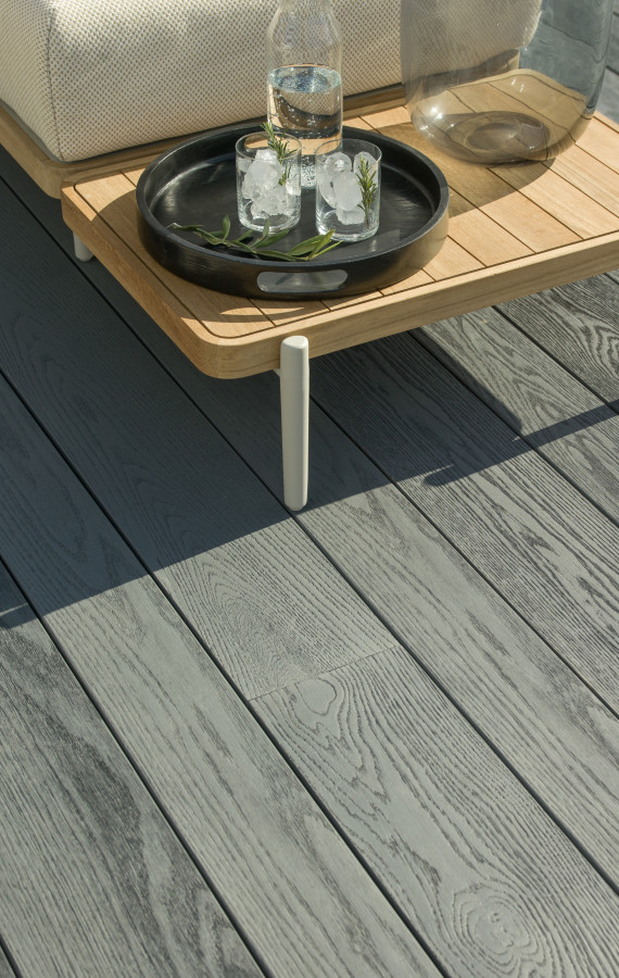 Brushed Basalt is the most authentic painted-wood-look decking board available. Consciously styled to work with interiors, Brushed Basalt's glamorous blue-grey hues are mesmerising and interplay beautifully with other cool and contemporary tones.