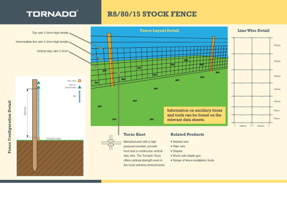 Tornado Torus R8/80/22 stock fence features solid vertical wires and the unobtrusive high pressure bonded Torus knot which does not have any sharp edges. Tornado Torus Stock Fence is manufactured with high tensile wire which strains tighter than mild steel and so requires fewer intermediate posts, making it quicker to erect. It does not stretch with weathering so does not need to be retightened annually.